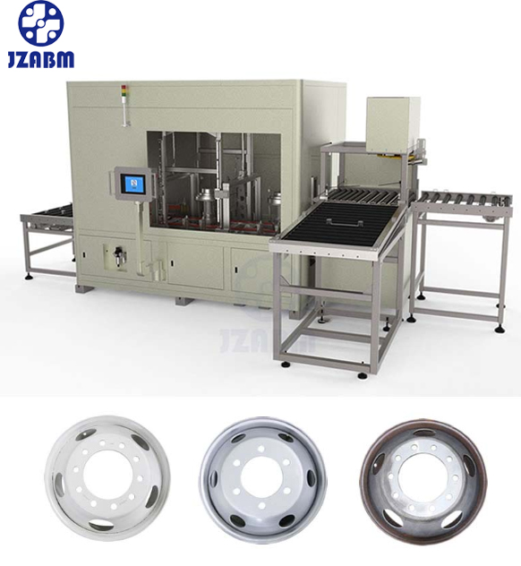 适用于钢制轮毂内外侧径向和轴向跳动度的检测、两面不平 衡量及其静不平衛量测量,并可对跳动高点、低点与平衡轻点、重点进行自动定位,带有轮毂搬入、搬出等自动搬送机构。